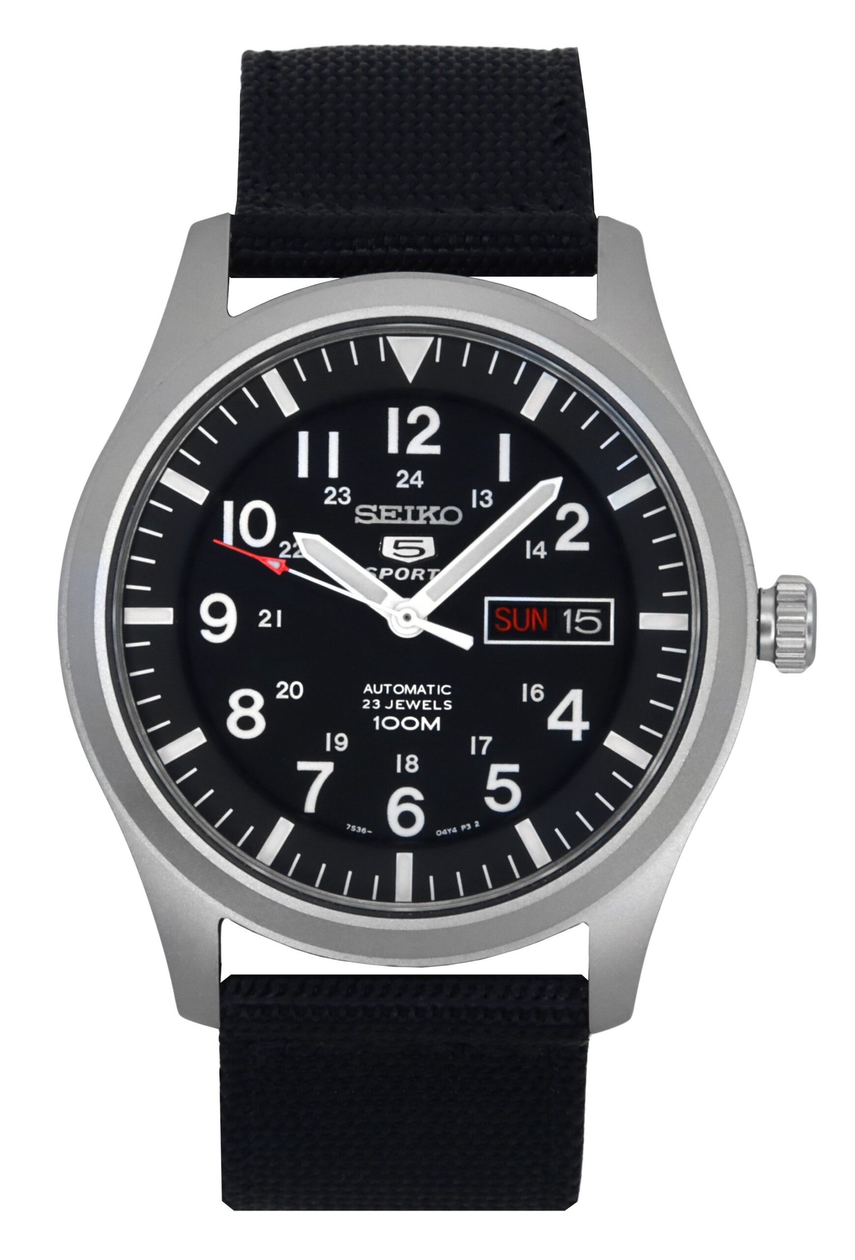 Features: Stainless Steel Case Nylon Strap Automatic Movement Caliber: 7S36 23 Jewels Mineral Crystal Black Dial Analog Display 12/24 Hours Display Lumibrite Hands And Markers Day And Date Display At 3 O’clock Position Pull/Push Crown See Through Case Back Buckle Clasp 100M Water Resistance Approximate Measurements: Case Diameter: 40.5mm (Excluding Crown) Case Diameter: 43mm (Including Crown) Case Thickness: 12mm